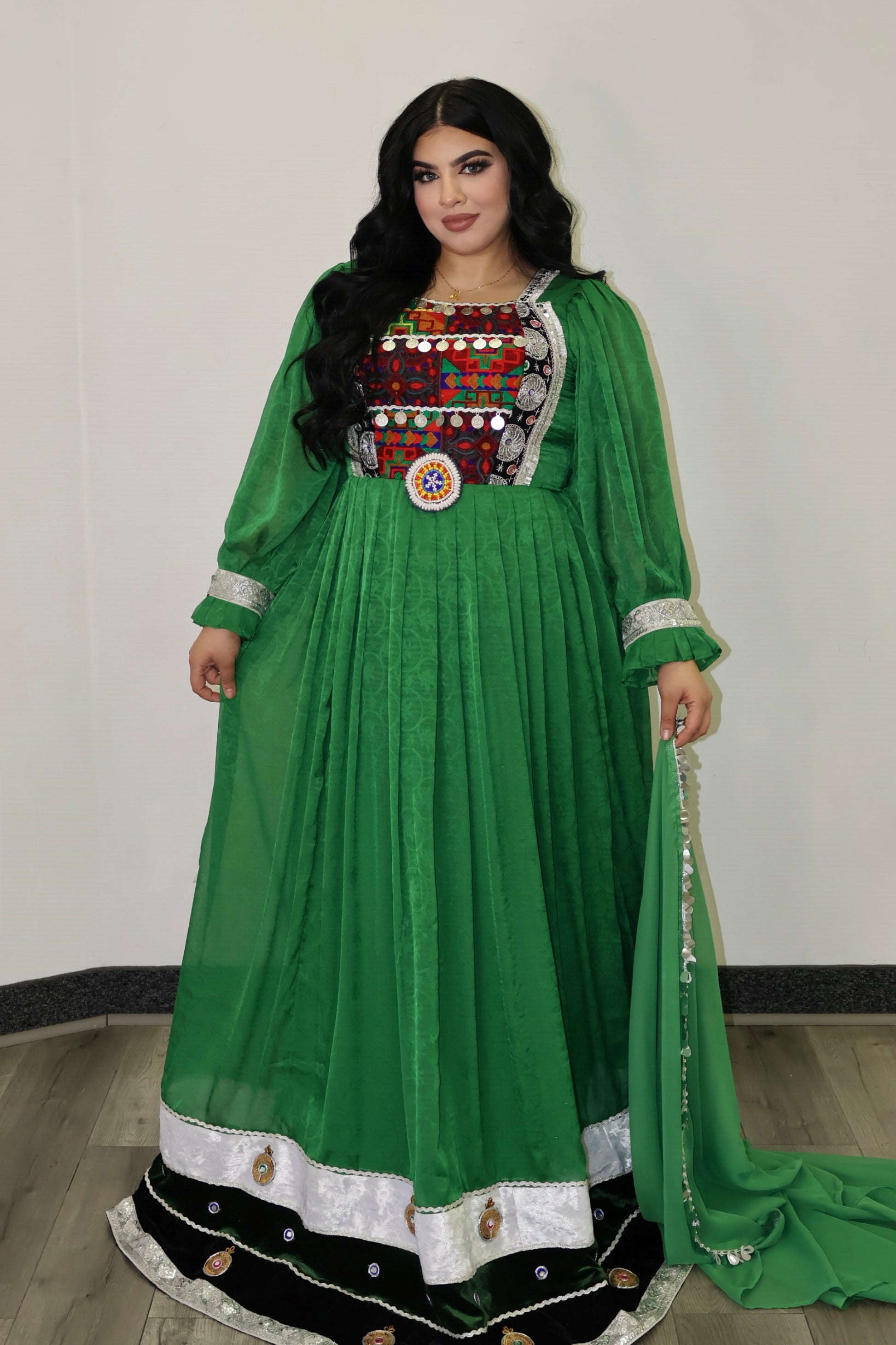 Perfect for any occasion! This Afghan one-size Dress is available a maxi dress that features long sleeves, with a figure-flattering fit and a tieable belt (kamarband) in the back to accentuate your curves. This dress does include a scarf and does not include pants.