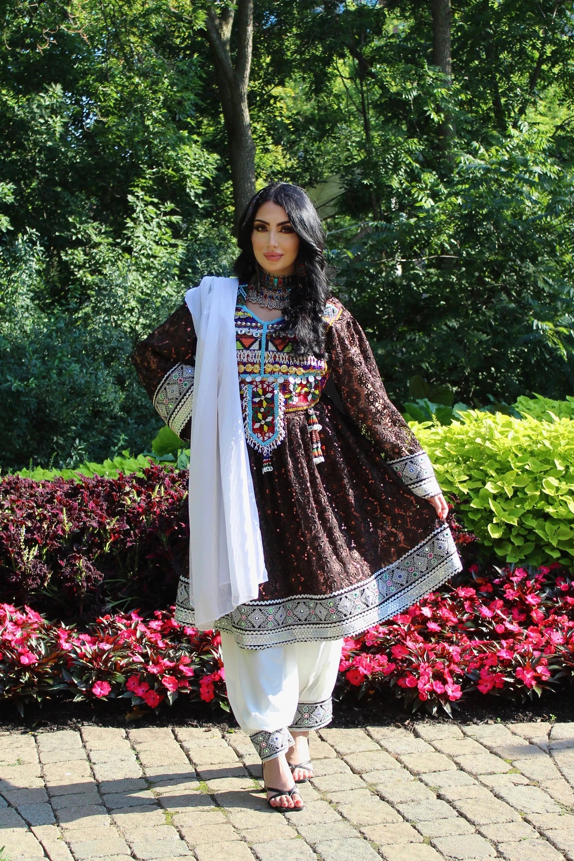 Perfect for any occasion! This Afghan one-size brown lace Dress is available in a short dress with white pants that features long bell sleeves, a figure-flattering fit with a tieable belt (kamarband) in the back to accentuate your curves.