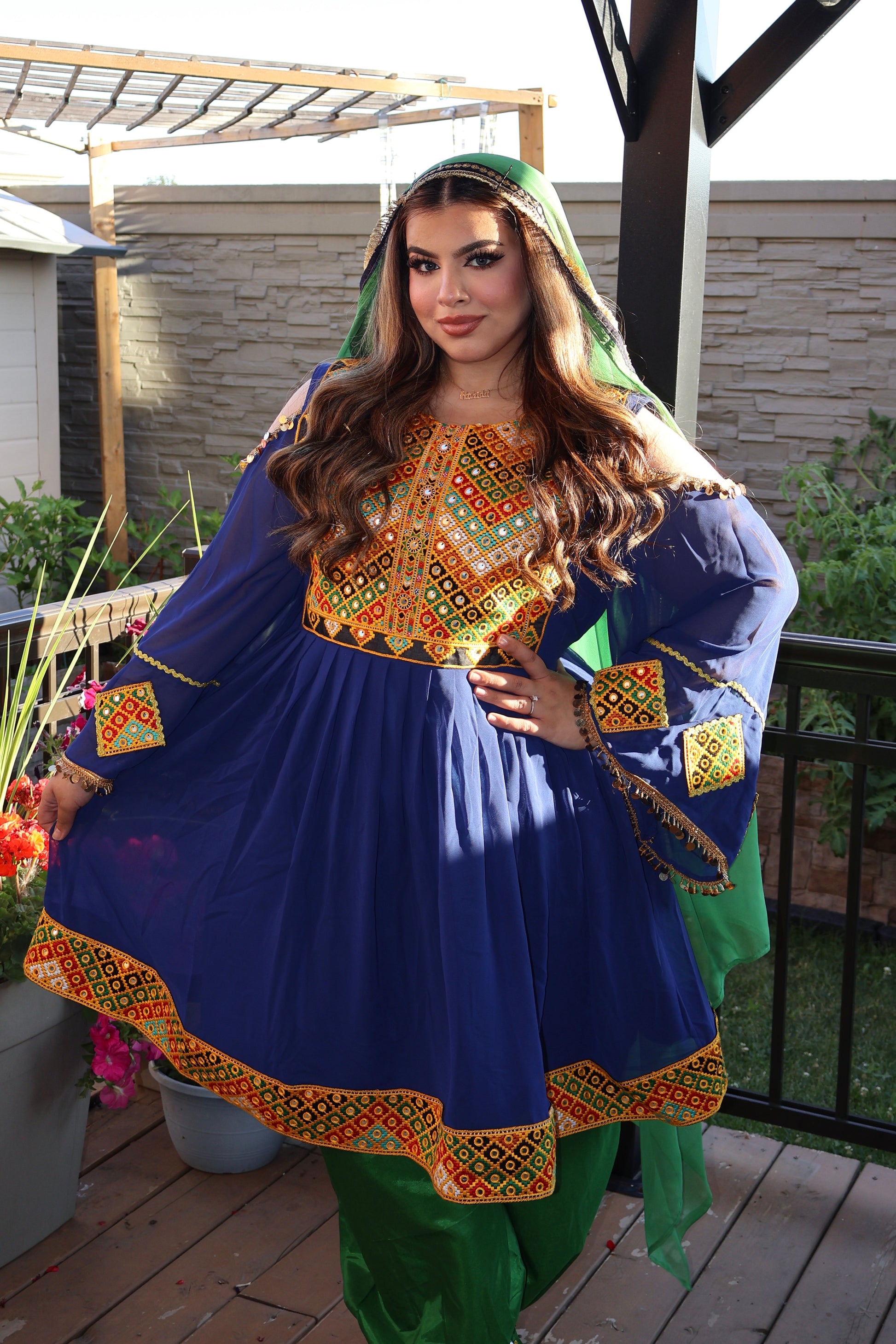 Perfect for any occasion! This Afghan one-size Dress is available in a short dress with pants that features long bell sleeves, a figure-flattering fit with a tieable belt (kamarband) in the back to accentuate your curves.