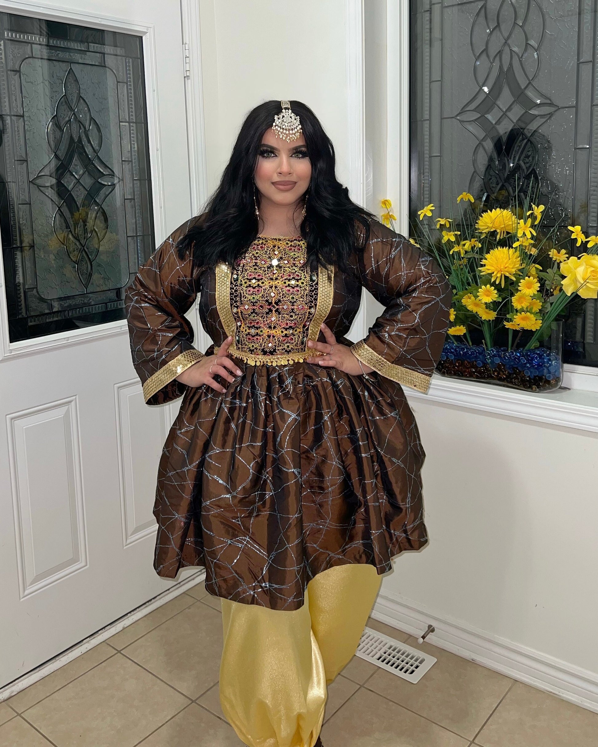 Perfect for any occasion! This Afghan one-size Dress is available in a short dress with pants that features long sleeves, a figure-flattering fit with a tieable belt (kamarband) in the back to accentuate your curves.