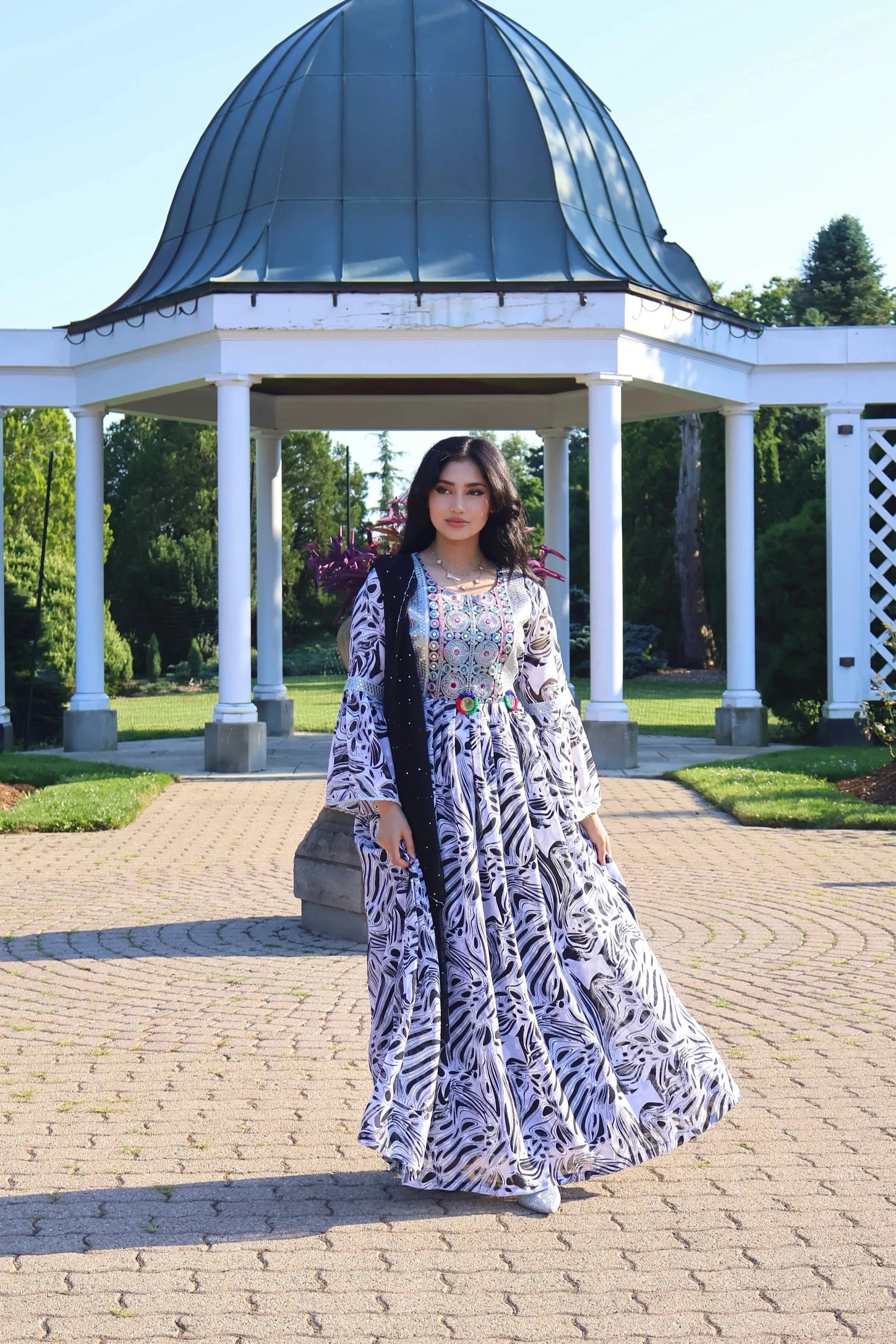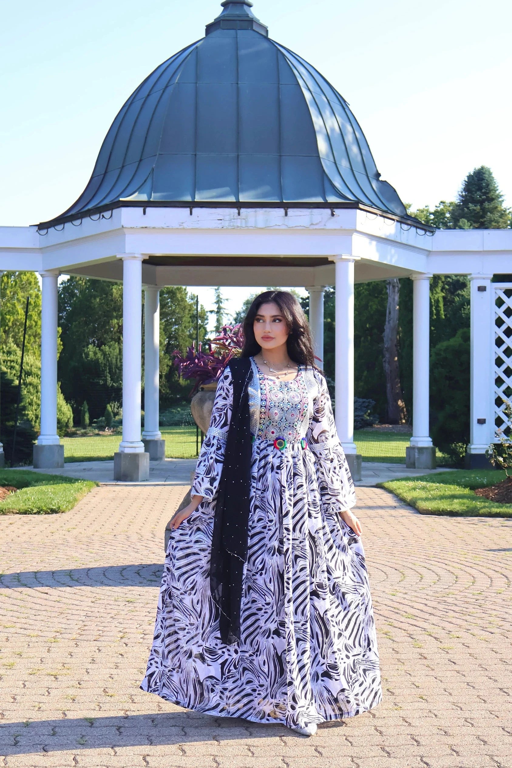 Perfect for any occasion! This Afghan one-size Dress is available in a maxi that features long bell sleeves, a figure-flattering fit with a tieable belt (kamarband) in the back to accentuate your curves.