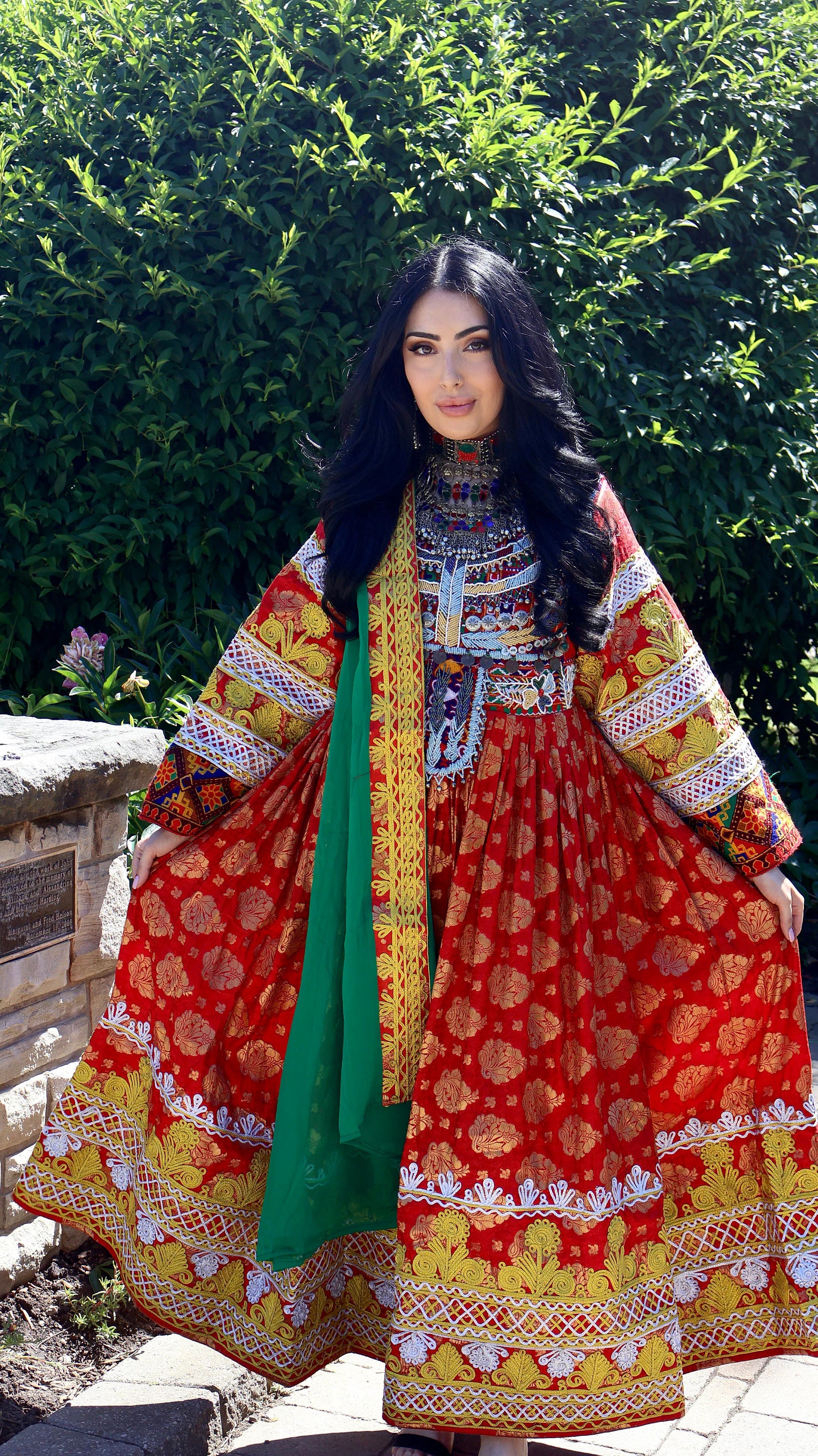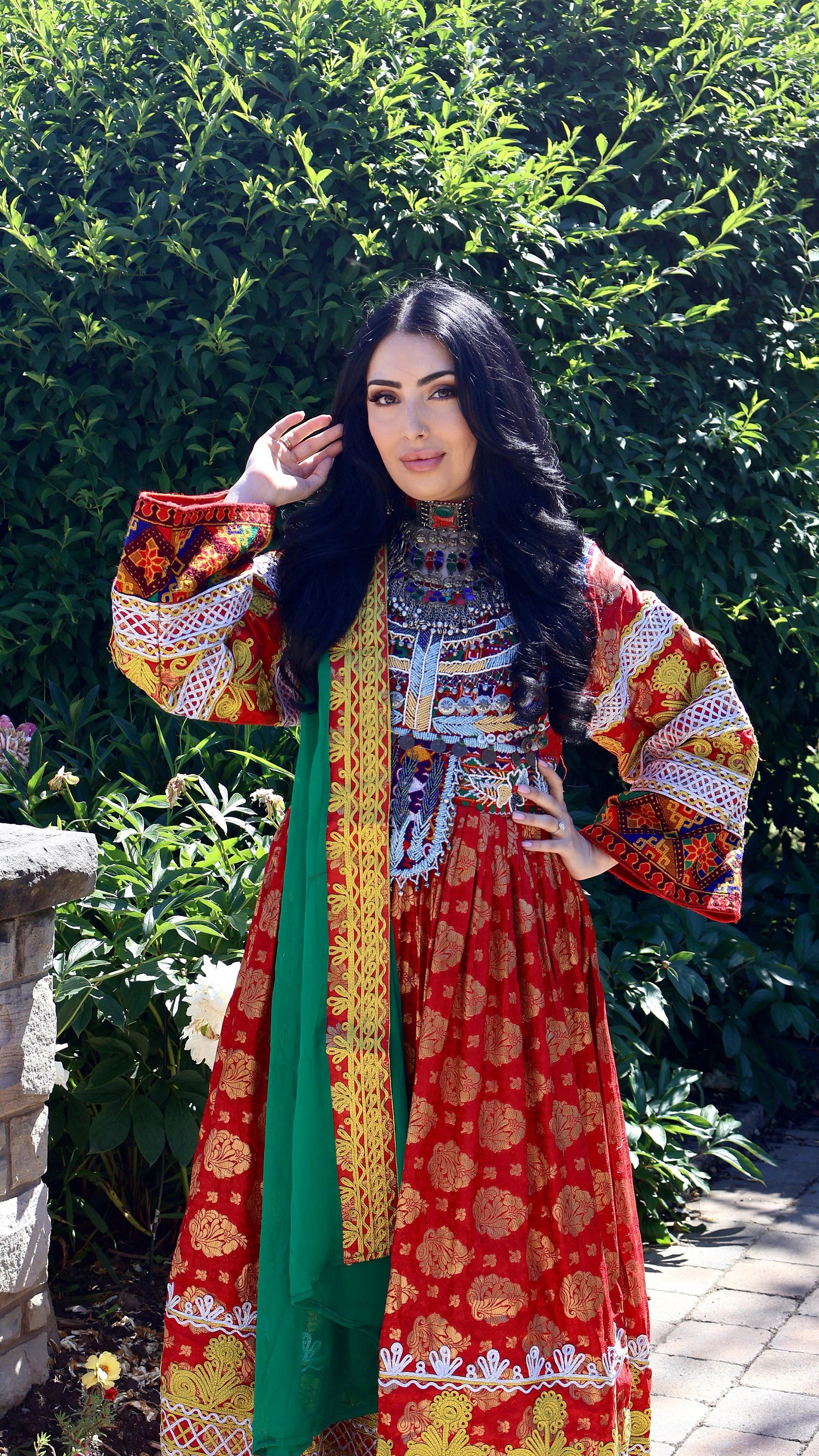 Perfect for any occasion! This Afghan one-size Maxi Dress that has bell sleeves, a figure-flattering fit with a tieable belt (kamarband) in the back to accentuate your curves.