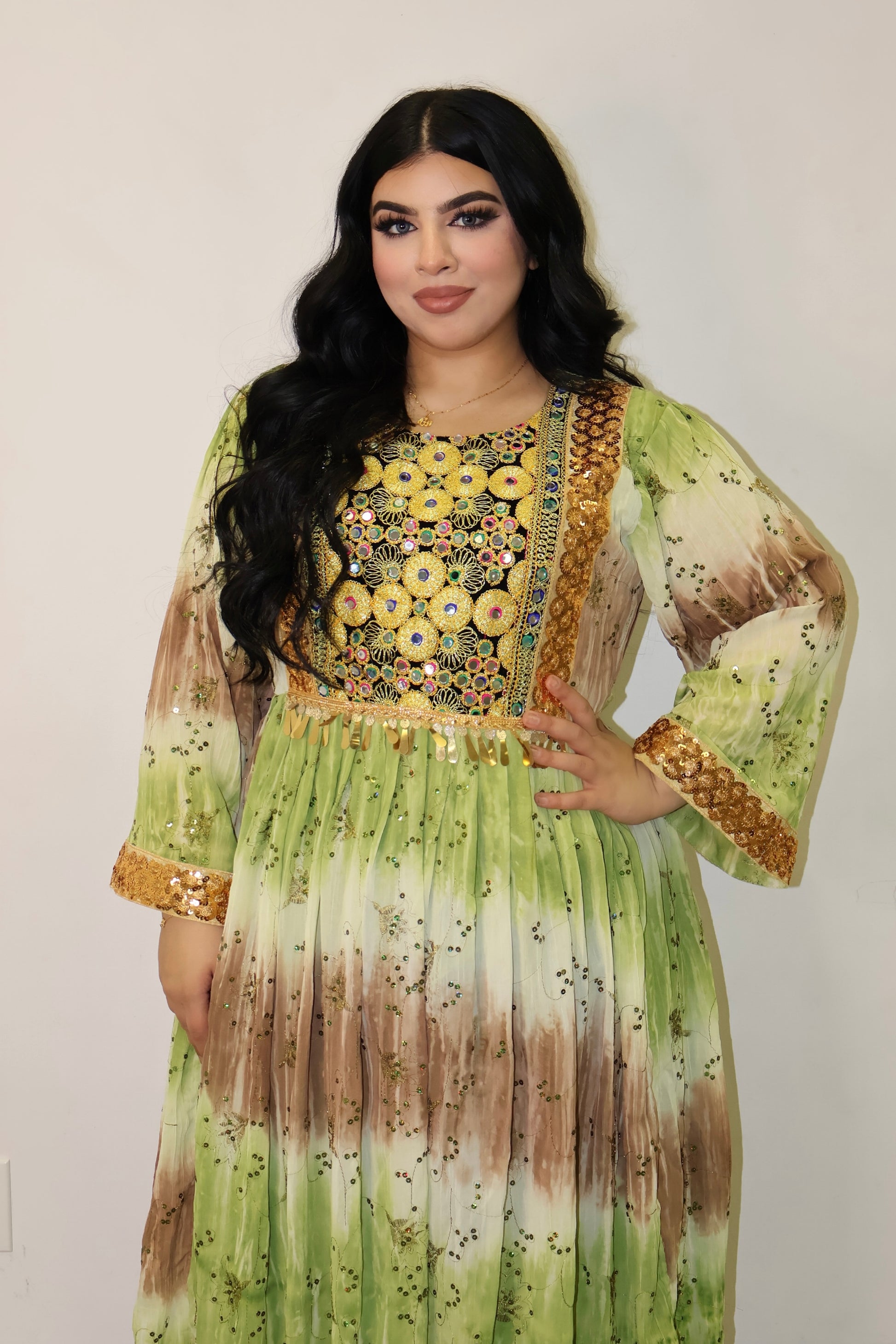 Perfect for any occasion! This Afghan one-size Dress is available in a maxi that features long sleeves, a figure-flattering fit with a tieable belt (kamarband) in the back to accentuate your curves.