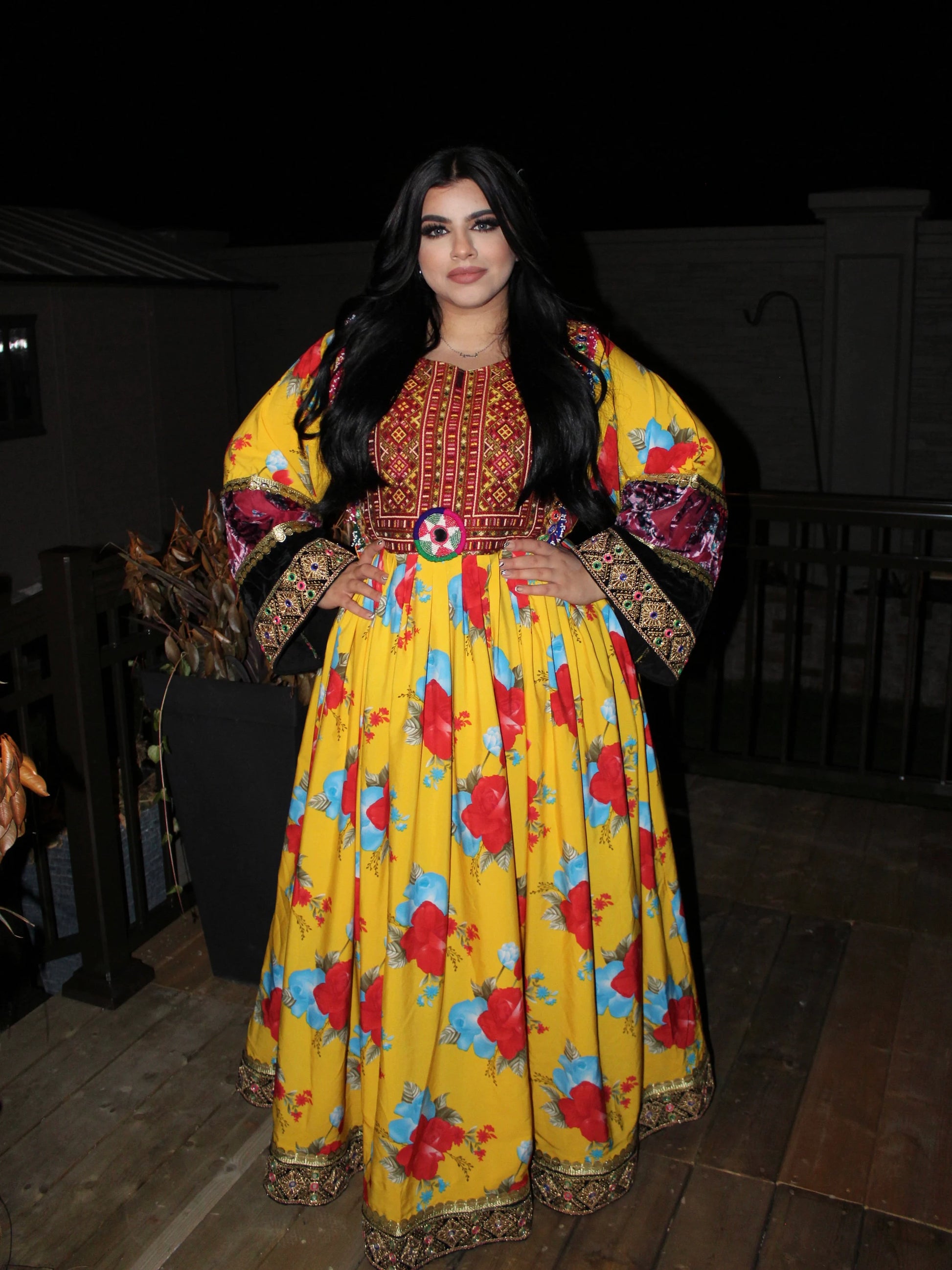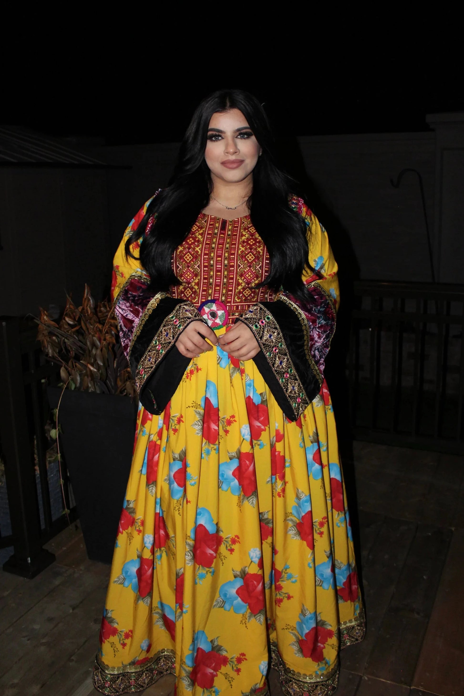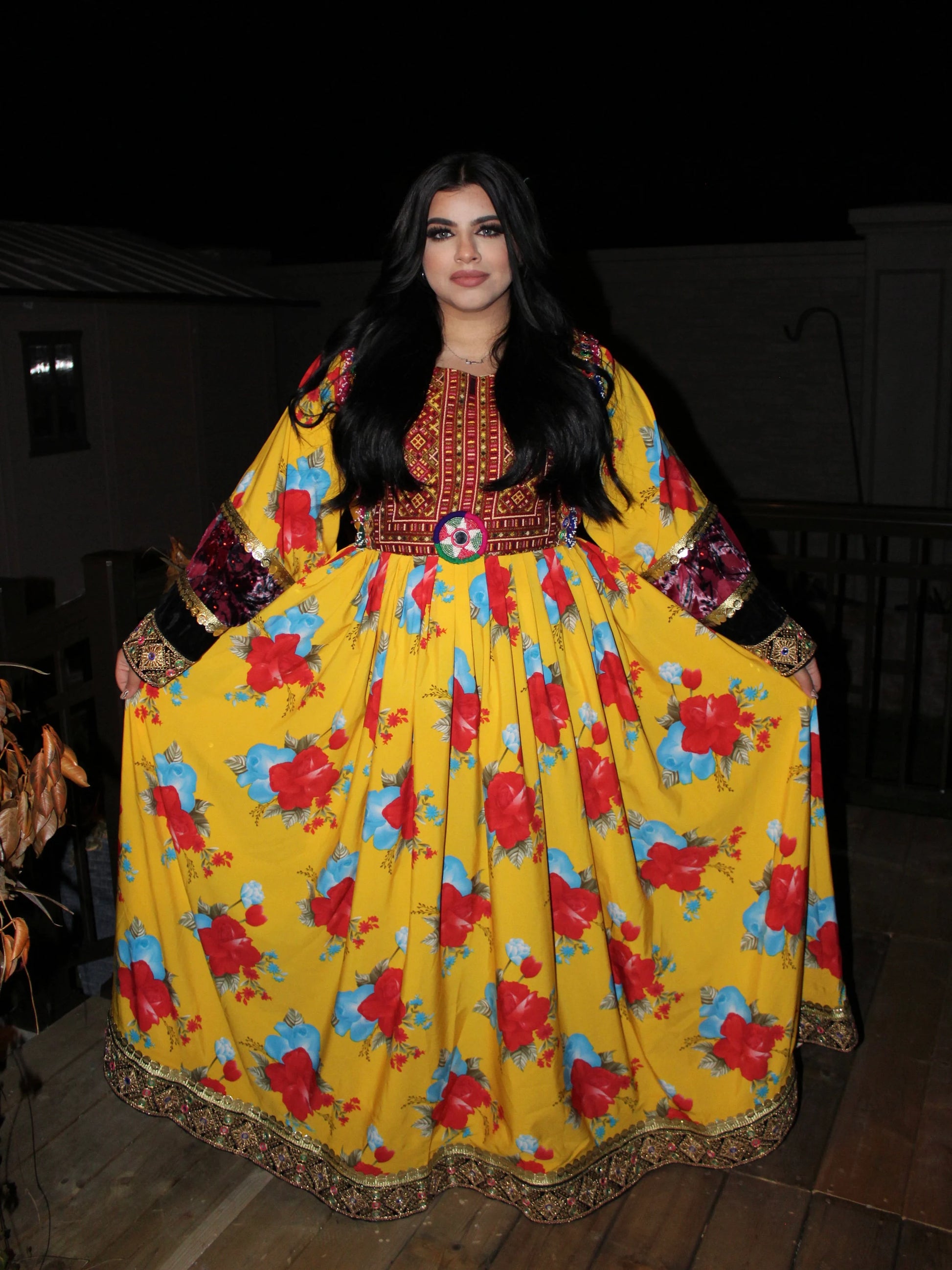 Perfect for any occasion! This Afghan one-size Dress is available in a maxi dress bell sleeves, a figure-flattering fit with a tieable belt (kamarband) in the back to accentuate your curves.