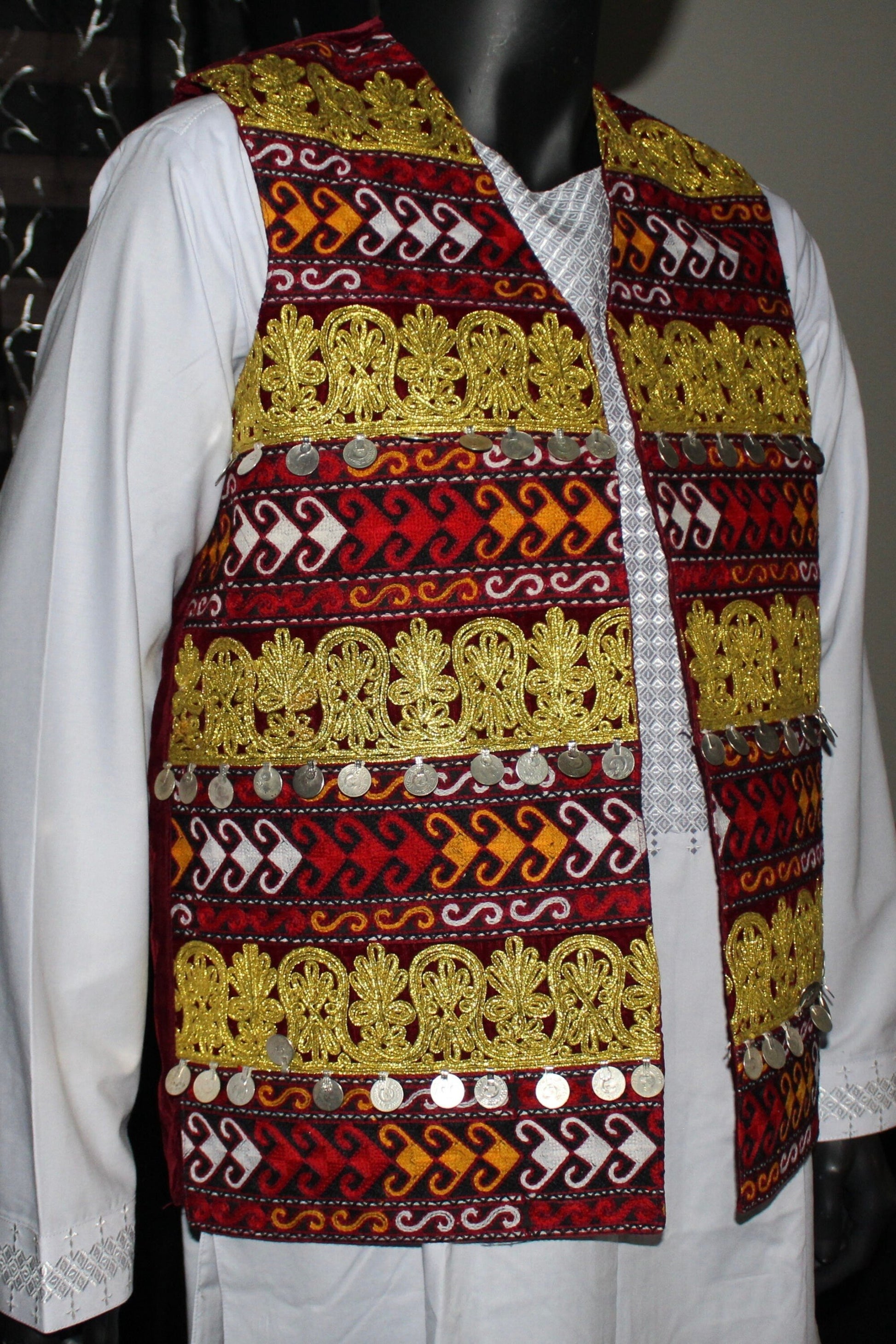 This Afghan Vest is Perfect for any Afghan occasion! Resembles the Afghan Flag and made out of velvet material with a double layer, giving this piece quality and luxury.