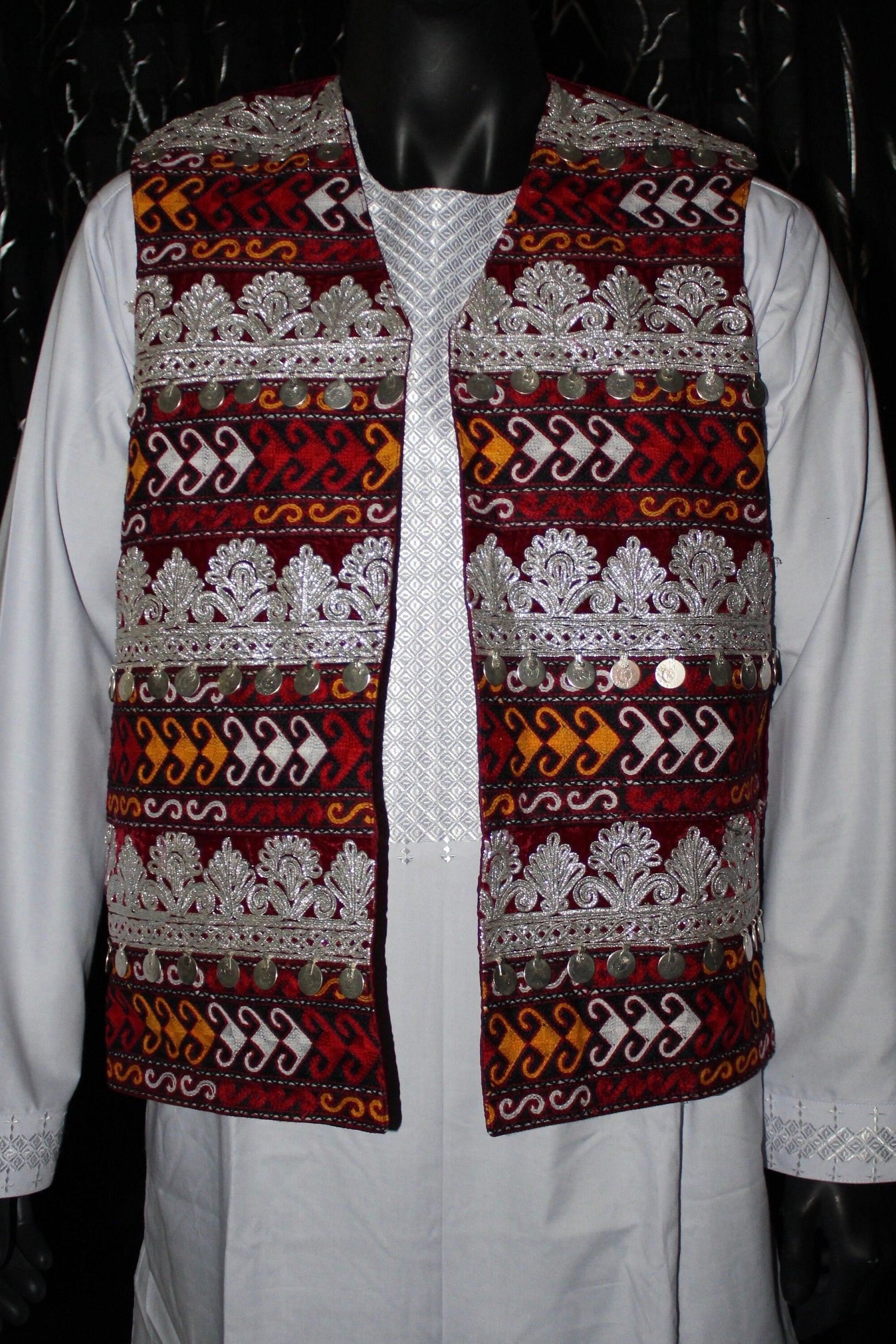 This Afghan Vest is Perfect for any Afghan occasion! Resembles the Afghan Flag and made out of velvet material with a double layer, giving this piece quality and luxury.