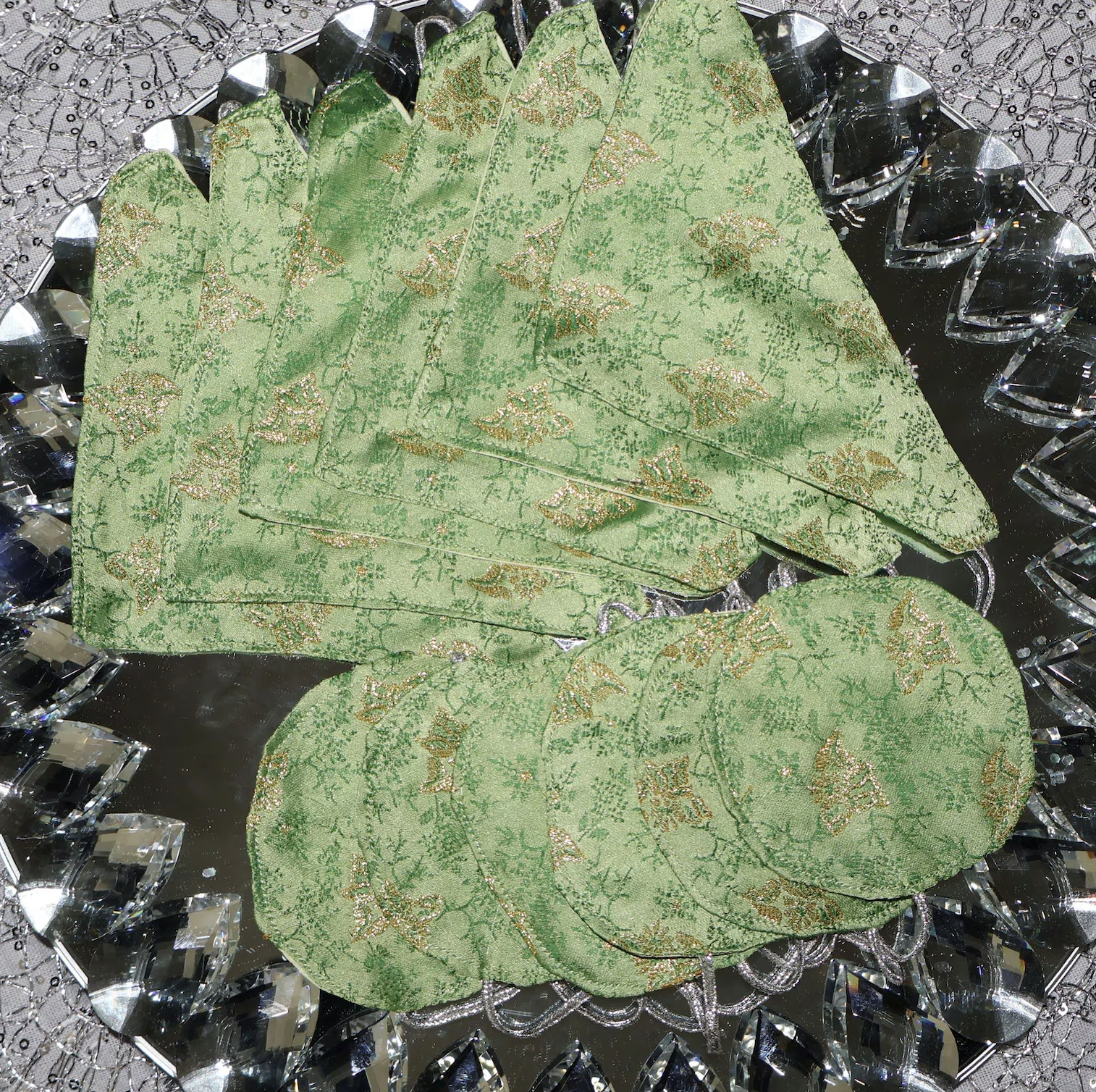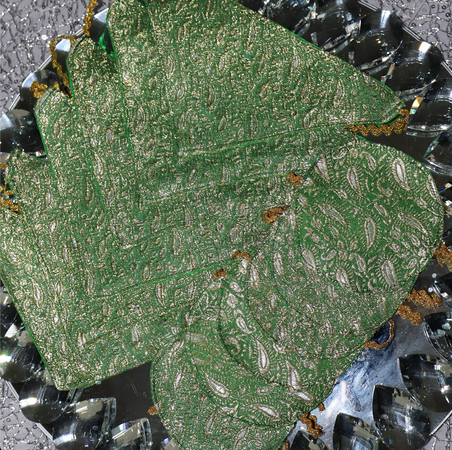The perfect Handmade Afghan Henna Wraps! A two layer henna wrap with green binarasi fabric on top and green cotton fabric on the bottom with silver trim ties. This set includes 6 triangle wraps and 6 circle wraps!